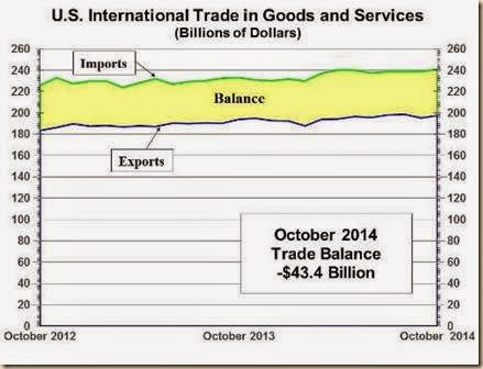 US exports and imports of goods not seasonally adjusted in Jan-Oct 2014 and Jan-Oct 2013 are in Table IIA-4. The rate of growth of exports was 3.3 percent and 3.3 percent for imports. The US has partial hedge of commodity price increases in exports of agricultural commodities that increased 6.5 percent and of mineral fuels that increased 11.0 percent both because prices of raw materials and commodities increase and fall recurrently as a result of shocks of risk aversion and portfolio reallocations. The US exports an insignificant but growing amount of crude oil, increasing 10.0 percent in cumulative Jan-Oct 2014 relative to a year earlier. US exports and imports consist mostly of manufactured products, with less rapidly increasing prices. US manufactured exports increased 1.1 percent while manufactured imports rose 5.0 percent. Significant part of the US trade imbalance originates in imports of mineral fuels decreasing 7.6 percent and petroleum decreasing 8.9 percent with wide oscillations in oil prices. The limited hedge in exports of agricultural commodities and mineral fuels compared with substantial imports of mineral fuels and crude oil results in waves of deterioration of the terms of trade of the US, or export prices relative to import prices, originating in commodity price increases caused by carry trades from zero interest rates. These waves are similar to those in worldwide inflation (http://cmpassocregulationblog.blogspot.com/2014/11/squeeze-of-economic-activity-by-carry.html). There is current reversal because of the sharp decline of commodity prices.